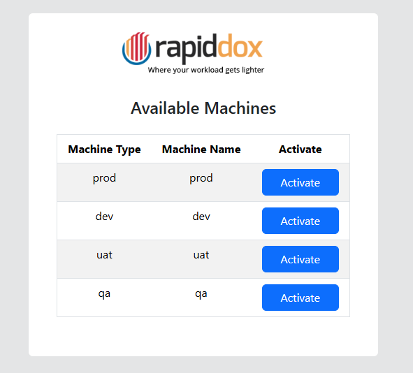 Available machines to activate: | ID | Machine type | Machine name | 1 | production | (prod) | 2 | development | (dev) | 3 | uat | (uat) | 4 | qa | (qa) Enter the machine ID to use: |