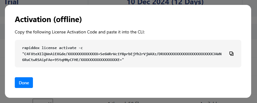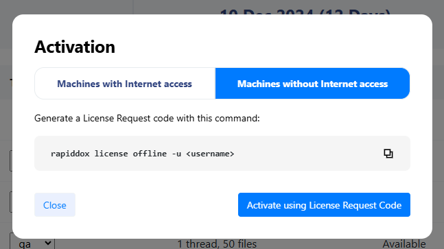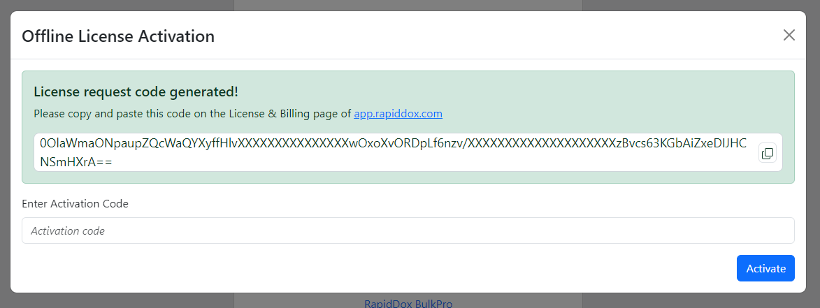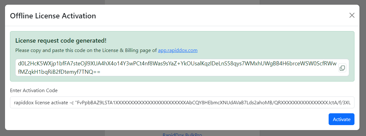 rapiddox license offline -u chris@factualsoft.comLicense request code generated! Please copy and paste this code on the License & Billing page of RapidDox customer portal: