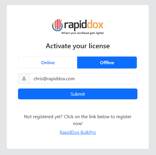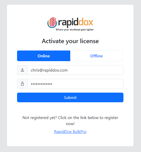 Within this document, you will discover a detailed, step-by-step procedure for activating the RapidDox BulkPro application, accessible through both online and offline modes.